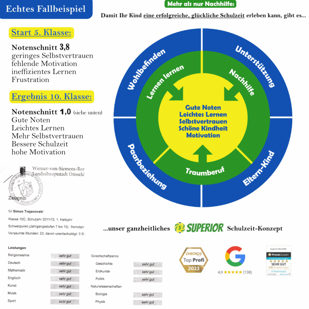 Wirklich glückliche Eltern und Schüler bleiben bei uns aus Zufriedenheit, weil sich die Noten deutlich verbessern, die Kinder wieder den Anschluss in der Schule finden und eine positive Einstellung zum Lernen entwickeln.